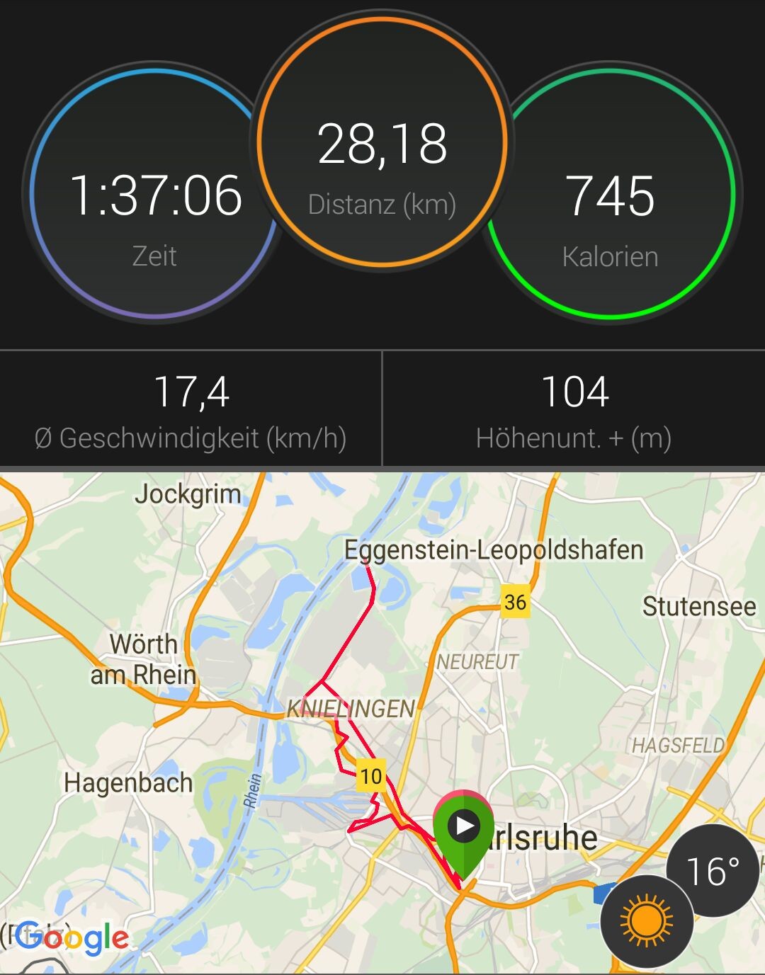 Genuss-Gruppe: 26,47 km; 1:32 Stunden; Strecke über Knielingen zum Rhein und zurück nach Karlsruhe.