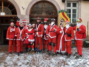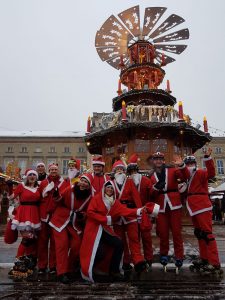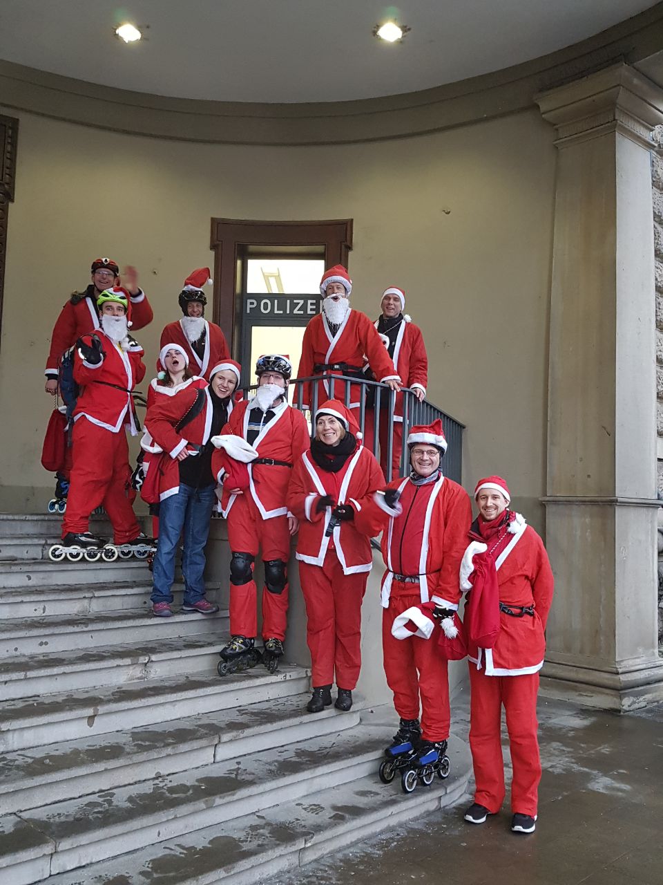 Nachdem wir uns um 11:00 Uhr zum gemeinsamen Nikolaus-Brunch im Badisch Brauhaus trafen, gingen wir gegen 14:00 Uhr gut gestärkt auf die Strecke. Aufgrund des Schneefalls wurde die Strecke kurzerhand in die Innenstadt von Karlsruhe verlegt. Auf dem weihnachtsmarkt gab es für alle „Nikolausskater“ einen Glühwein. Unsere „zu Fuß Gruppe“ ohne Inlineskates trafen wir an verabredeten Punkten immer wieder. Allen Beteiligten und sogar den Passanten hat es sehr großen Spaß bereitet. Hier eine kleine Auswahl an Impressionen: